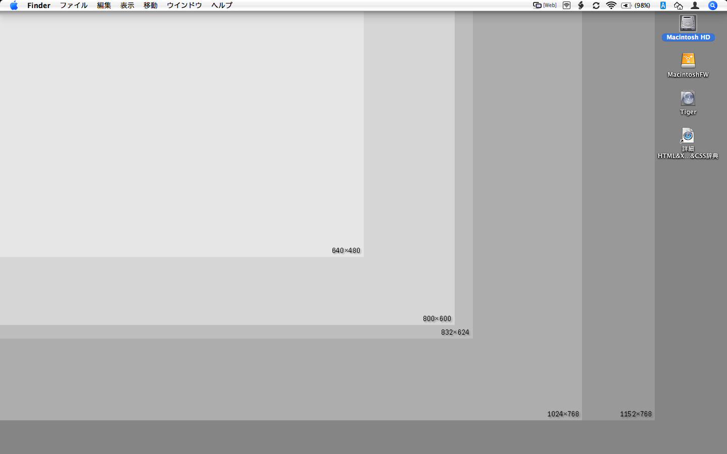 壁紙に使っているのはモニターの画面サイズ。サイトを製作するときに、どれぐらいのサイズで表示されるのか確認するため。WindowsXPを使うときもあるので、優先事項は共有環境。ブラウザはFirefoxBookmarks Synchronizer で各OSのブックマークを同一環境に。メールはIMAPなのでサーバーに保存、ISPのアドレスはGmailに転送。ローカルにメールを保存しない